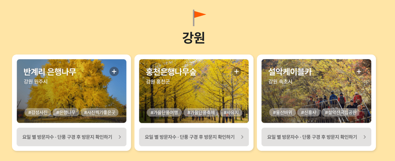 강원도는 원주시 반계리 은행나무와 홍천은행나무숲, 속초시에 있는 설악산 케이블카를 추천합니다.