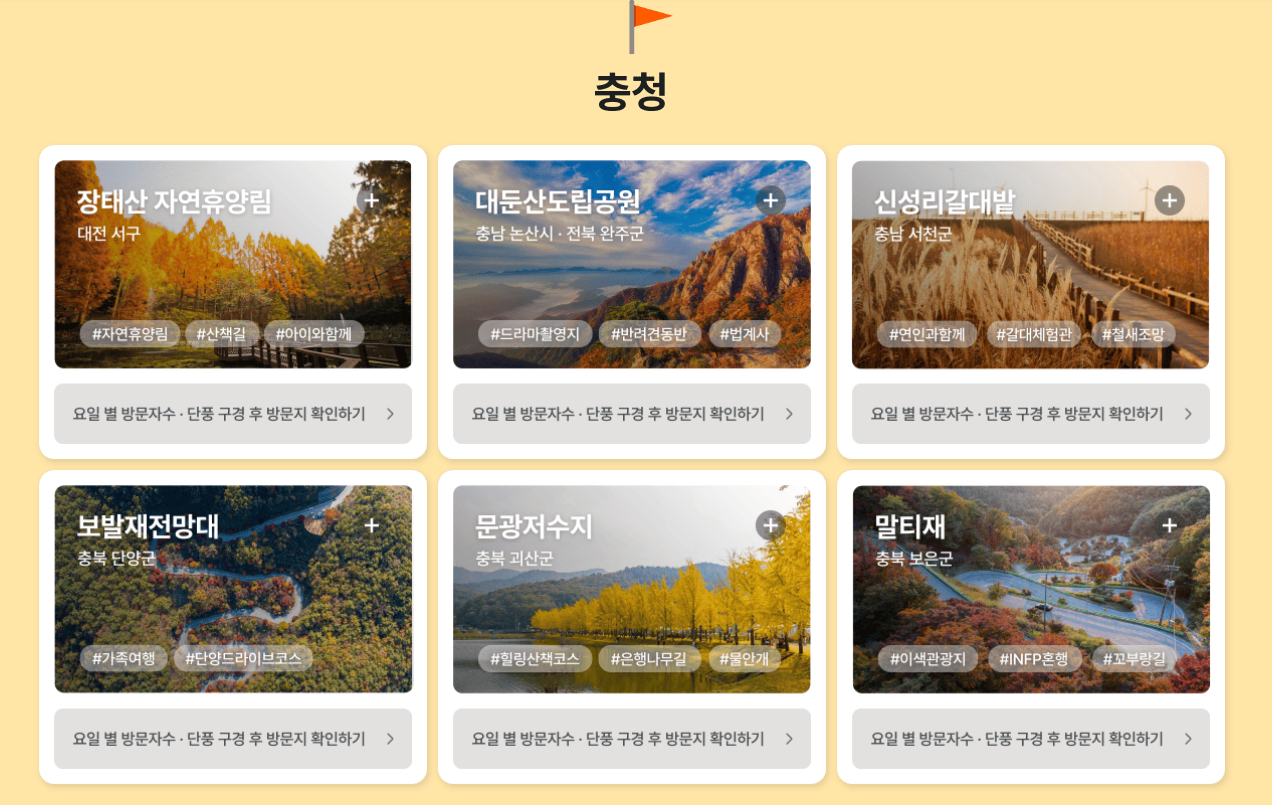 대전 장태산 자연휴양림과 논산 대둔산도립공원, 서천의 신성리갈대밭, 단양 보발재전망대, 괴산 문광저수지, 보은의 말티재 입니다.
