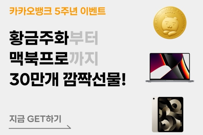 카뱅 5주년 모두의 서프라이즈 이벤트가 이자8%, 황금주화, 맥북프로 등등 이벤트 내용이 짱짱해서 저도 응모를 해봤습니다.